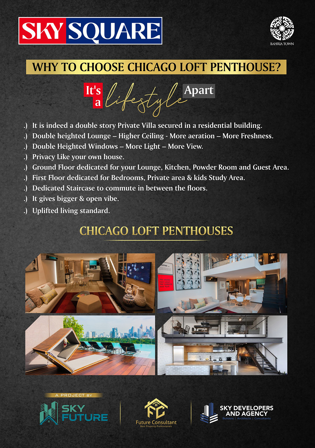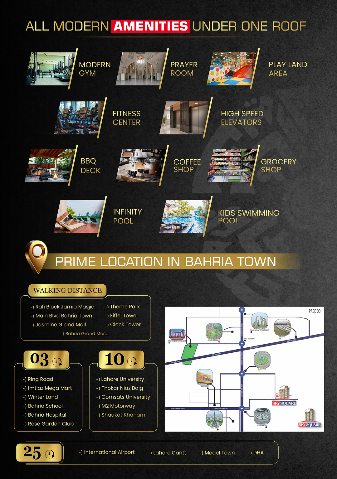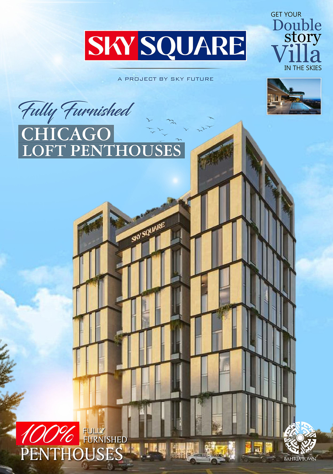 Sky Square offers 156 luxury units, including 1-2 bed apartments, lofts, and penthouses in Bahria Town Lahore, featuring premium amenities like an infinity pool, gym, kids' pool, and retail conveniences, including a pharmacy and grocery store, all designed for modern upscale living by Sky Future.