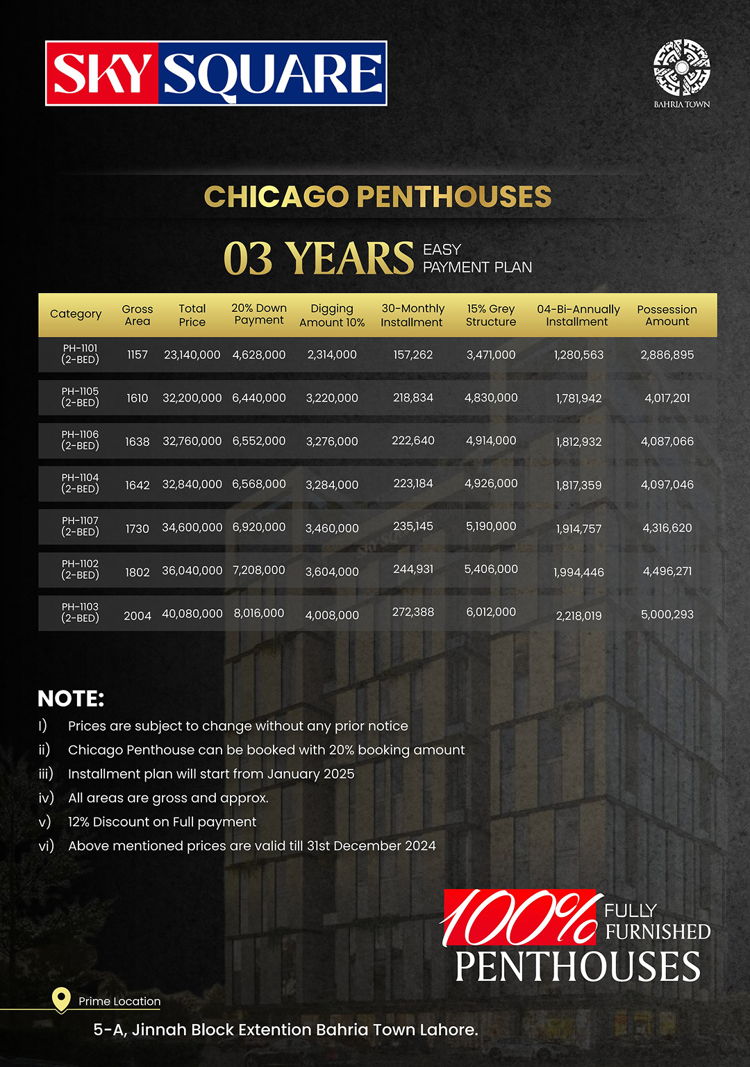 Sky Square’s 3-year payment plan for fully furnished Chicago Penthouses on the 11th floor starts at PKR 23,140,000 for a 1,157 sq.ft. unit, with a 20% down payment (PKR 4,628,000), 10% digging amount (PKR 2,314,000), 30 monthly installments of PKR 157,262, 15% grey structure (PKR 3,471,000), 4 bi-annual installments (PKR 1,280,563), and a possession amount of PKR 2,896,895. A 12% discount applies on full payment.