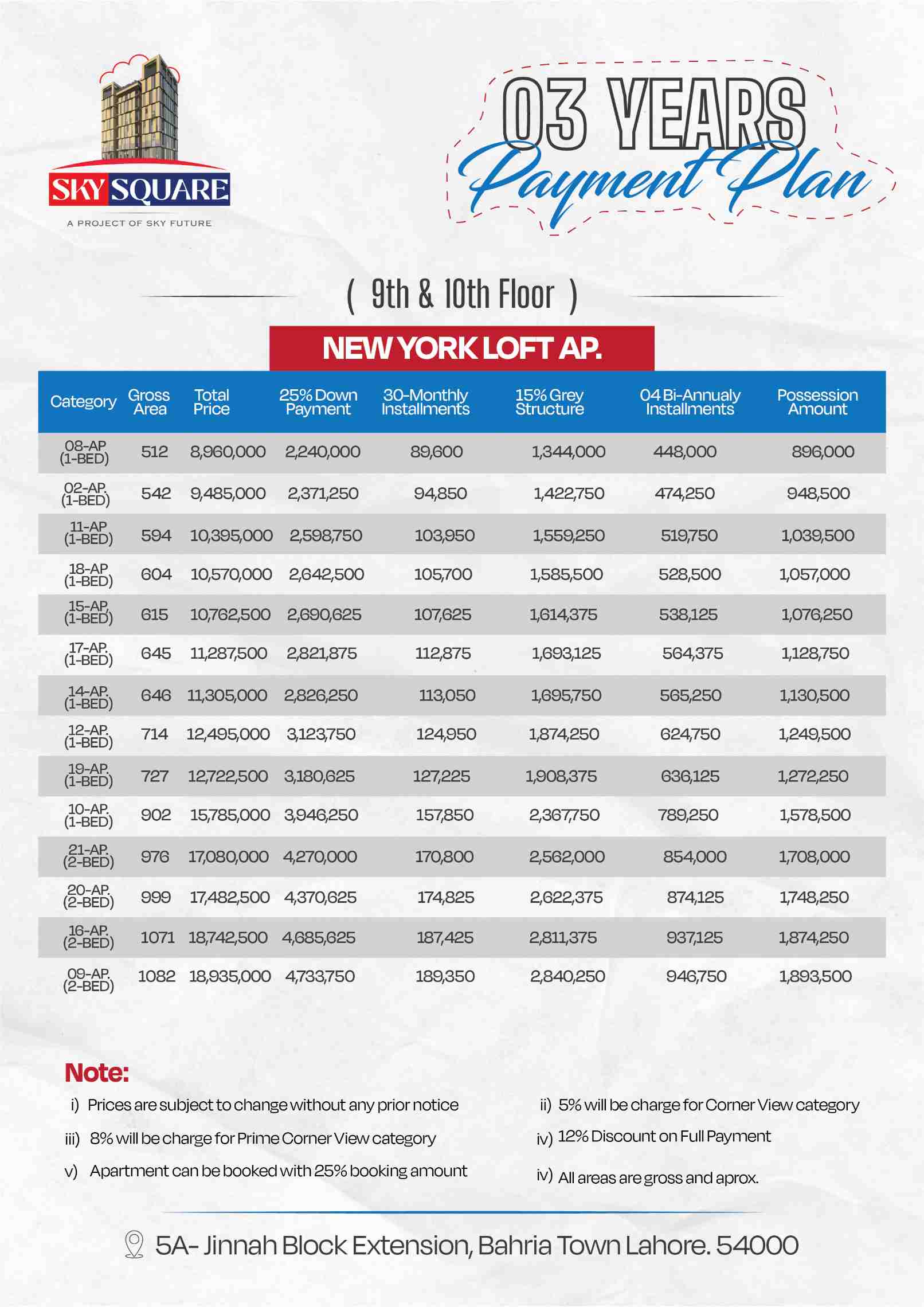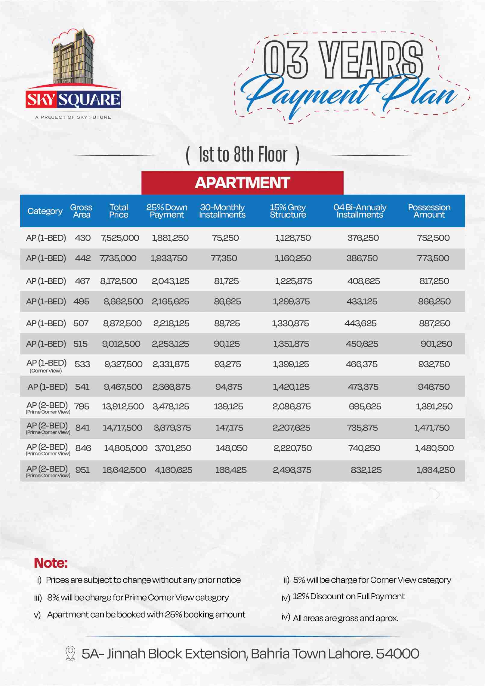Sky Future Apartments offers a 3-year payment plan for apartments on floors 1–8, starting at PKR 7,735,000 for a 442 sq.ft. 1-bedroom unit. The plan includes a 25% down payment of PKR 1,933,750, followed by 30 monthly installments of PKR 77,350, a 15% grey structure payment of PKR 1,160,250, four bi-annual installments of PKR 386,750, and a final possession amount of PKR 773,500. Additional charges apply, with 5% for corner view and 8% for prime corner view, while buyers can also avail a 12% discount on full upfront payment .