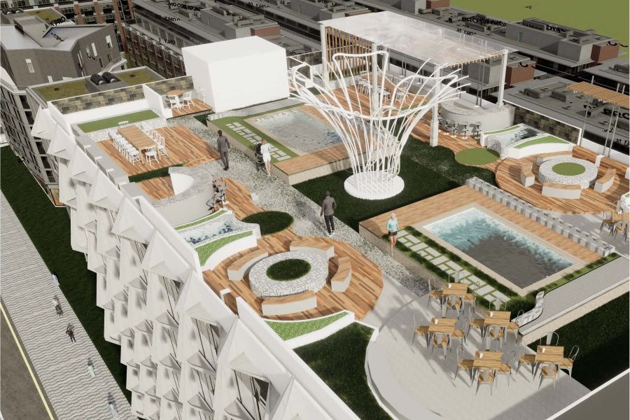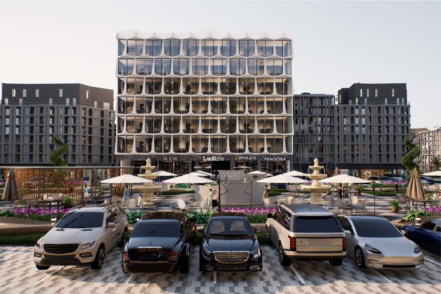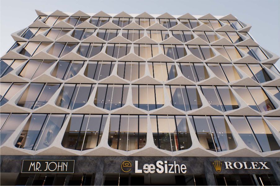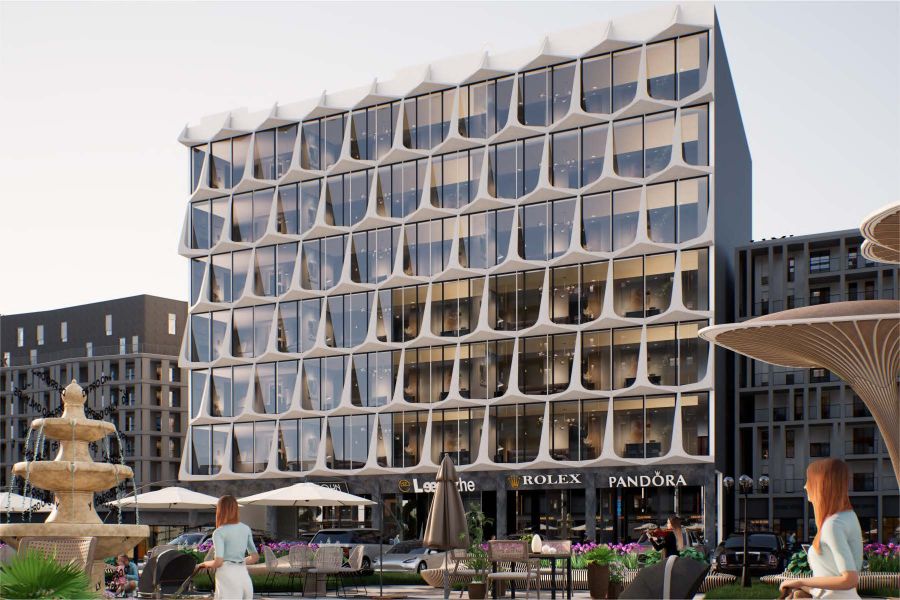 The elevation of Grand 15 highlights a modern, symmetrical design, seamlessly blending elegance with functionality. Premium glass facades and aesthetic architectural detailing enhance its brand visibility and urban appeal.