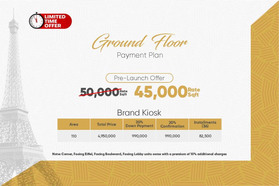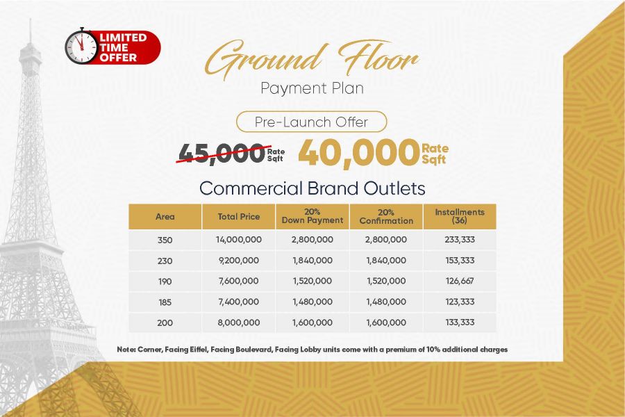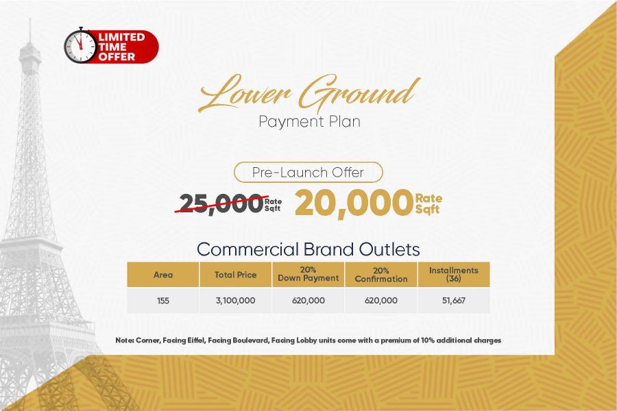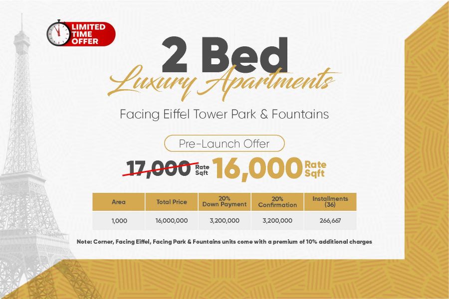 Discover the elegance of Grand 15 at The Grand Lifestyle, a premium mixed-use project offering commercial brand outlets and luxury service apartments right in the heart of Bahria Downtown. With competitive pre-launch prices, flexible installment plans, and views of the iconic Eiffel Tower & Park, Grand 15 is your next smart move for business and lifestyle.