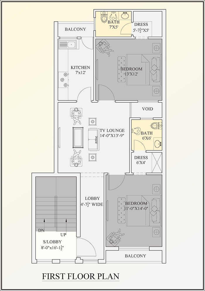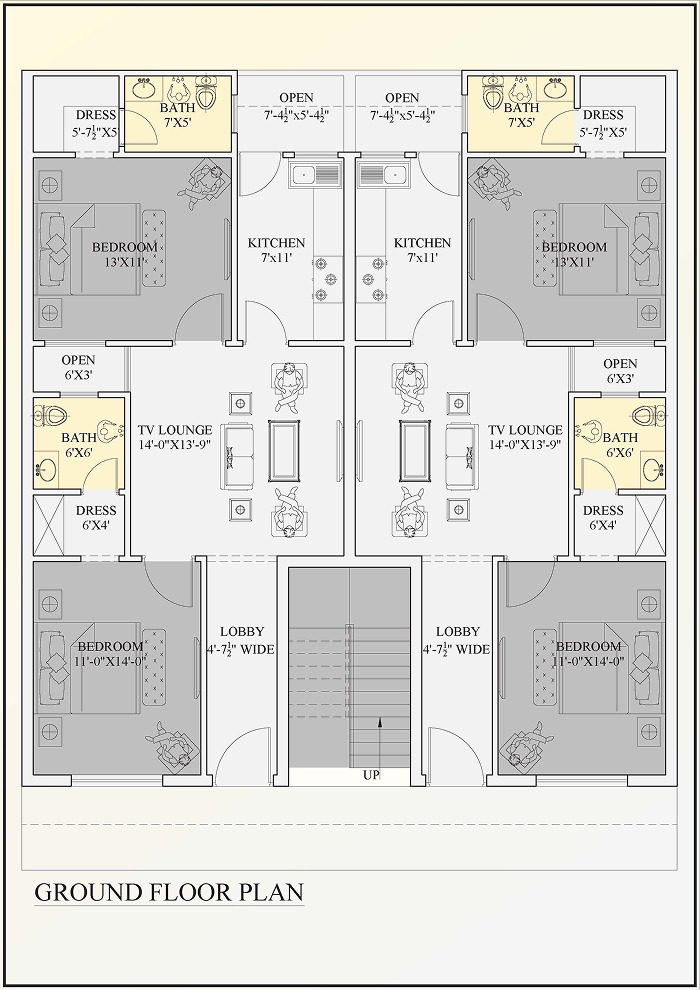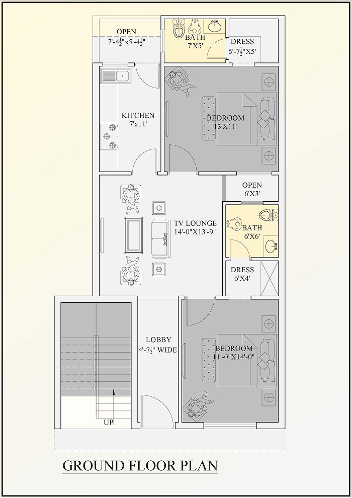 - Ground Floor: Spacious 13'×11' master bedroom, 11'×14' second bedroom, 14'×13'-9" TV lounge, 7'×11' kitchen, two full bathrooms with dressing areas, and a 4'-7" wide lobby for a welcoming entry.