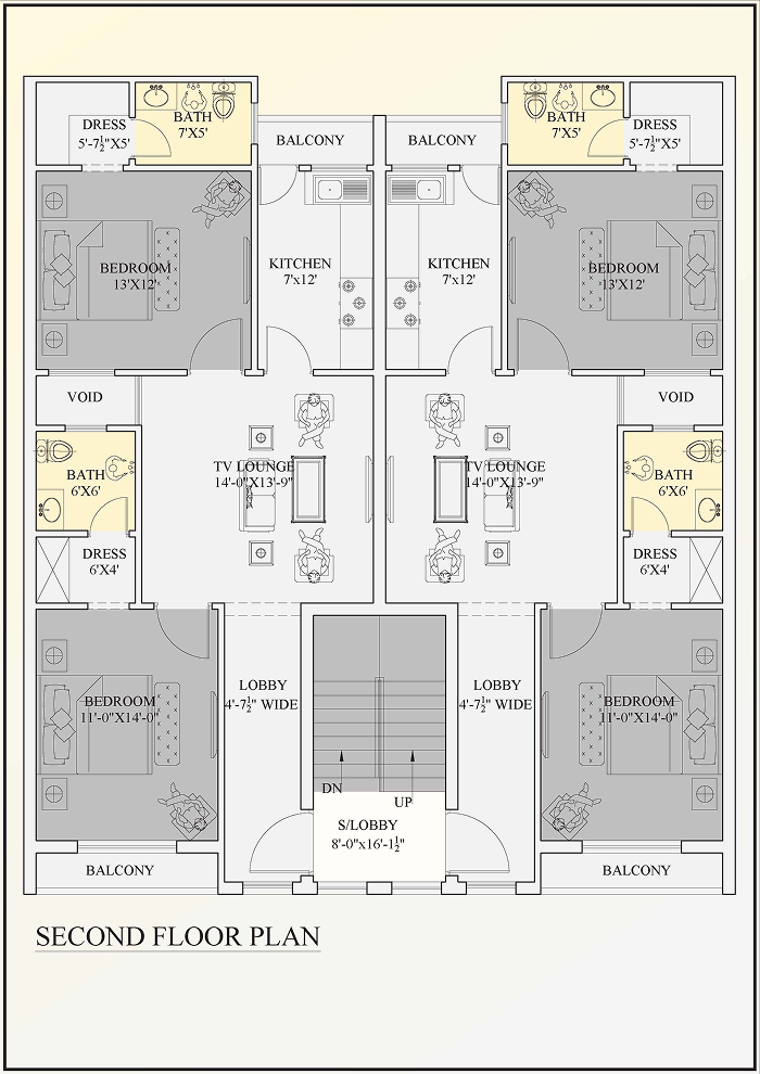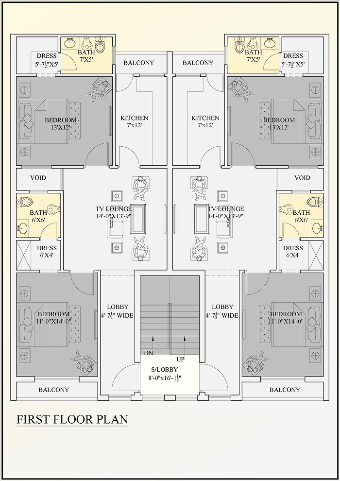 - First Floor: Upgraded 13'×12' master bedroom, 11'×14' second bedroom, open kitchen with balcony access, TV lounge, two balconies for natural ventilation, and a secondary staircase lobby (8'×16').