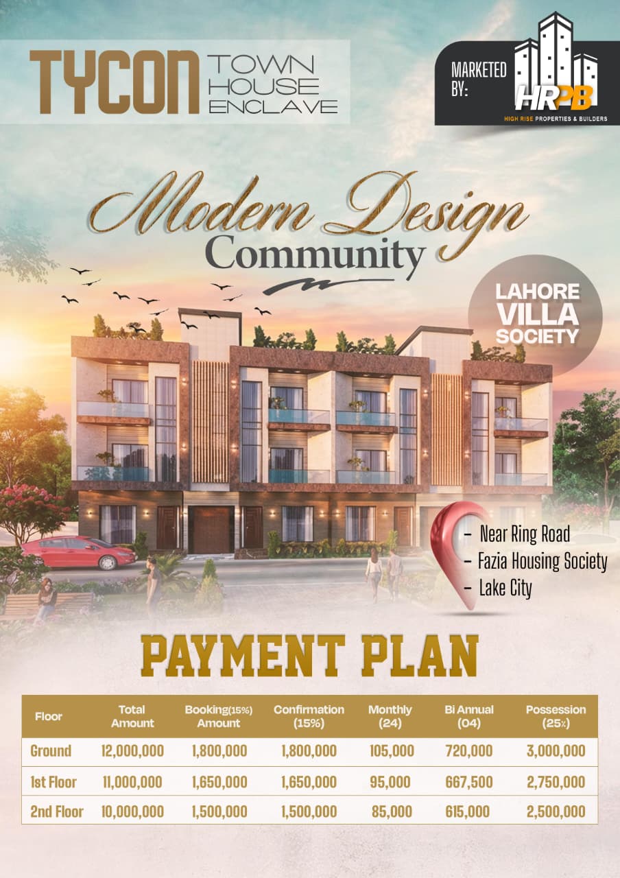 Tycon Townhouse Enclave in Lahore Villa Society offers a smarter way to own a home in one of the city's fastest-growing residential corridors. Developed with a modern community vision and marketed by High Rise Properties & Builders, this gated townhouse project brings together contemporary design, premium construction, and an investor-friendly payment structure. Strategically located near Ring Road, Fazia Housing Society, and Lake City, Tycon Townhouse Enclave delivers unmatched connectivity, long-term value appreciation, and a secure lifestyle for families and overseas investors alike.